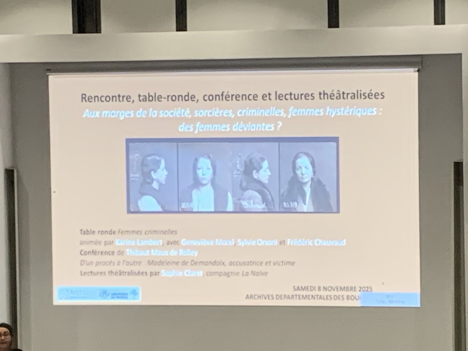Table ronde Femmes criminelles animée par Karine Lambert, avec Geniève Morel, Sylvie Orsoni et Frédéric Chauvaud, et organisée par les Archives départementales des Bouches-du-Rhône.